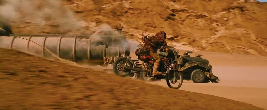 In the middle of writing the movie, Brendan McCarthy took a short break to a beach town on the Australian coast, Byron Bay. He wandered into a surfer's pub which had a big screen playing videos of track bikers doing incredible stunts. That's what gave McCarthy the idea for the canyon tribe, who leap over Furiosa's truck, "George Miller loved the high-flying action dynamics inherent in the idea and we worked a great deal on that sequence."[1]