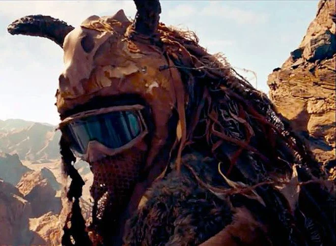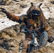Rock Riders wear tan leather trousers, tan shirts with strips of frayed brown fabric sewn to them, furs, helmets, and goggles with mesh or knit-fabric hanging from them. Bones are used as decoration.