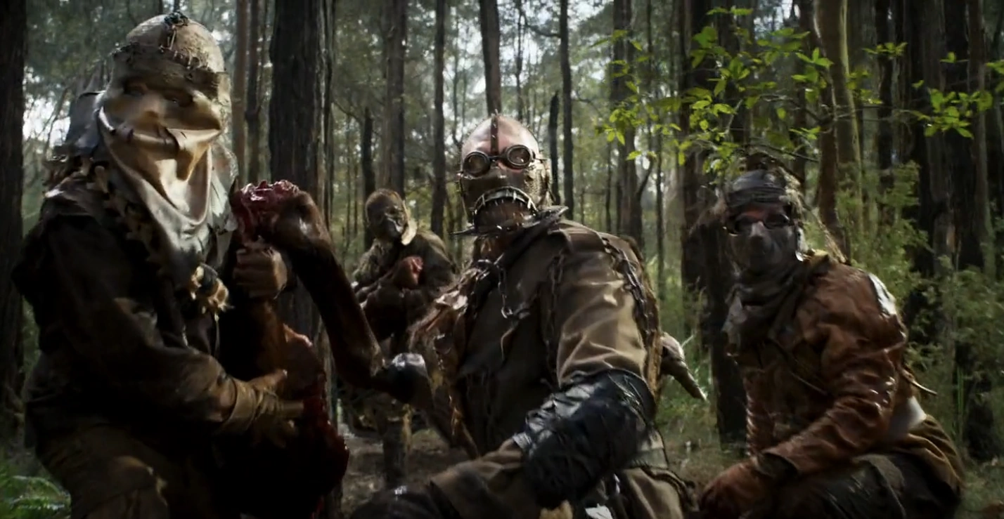 The Roobillies wear a variety of brown and beige garments, created mostly of tanned skins and natural fabrics. Unlike other members of the Biker Horde who wear clothing salvaged from the old world, the Roobillie's attire is almost entirely homemade or heavily worn, reflecting they're low status amongst the group. They appear to cover themselves with tanned animal hides, although human skin is also visible in they're outfits. Owing to they're cannibalistic tendencies, they adorn themselves with human bones such as skulls, jaws and vertebrae. Chains, locks and ropes are draped across they're bodies as well as scraps of metal and leather. One Roobillie is shown wearing a heavily worn Ghillie suit, tied across his body with twine. The Roobillies all wear hoods to obscure they're faces or makeshift helmets such as Vulture's. They're bone covered motorcycles are similarly ramshackle, and appear to be amalgamations of BMW bikes with various found items. The only named bike, the Thunderbike, features a horse skull, bull horns and repurposed car fender atop the back tire.