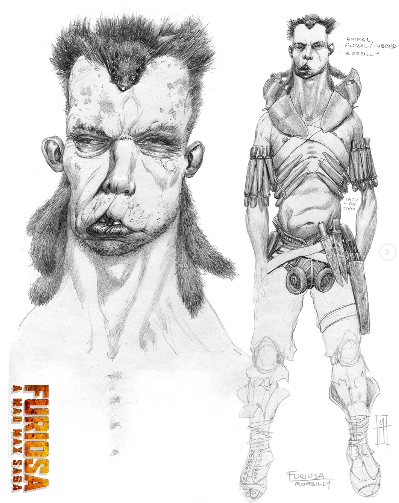 According to concept artist Matt Hatton, the Roobillies were originally created as one of 12 'tribes' apart of Dementus' biker horde, dubbed "The Terrible Twelve". Production designer Colin Gibson envisioned the gang as being 'Felliniesque', taking visual inspiration from carnivals and freak shows. As such, the original incarnation of the Roobillies was much more monstrous and disturbing than the final film. During concepting, the gang was made up entirely of mutants with severe physical deformities such as the ones seen in the Wretched, with women amongst they're ranks. One such design was for a 'Roobilly Mother' who possessed a cleft upper lip and wore a pig's scalp atop her head. Having suffered a miscarriage, she can be seen carrying the unborn child in a makeshift baby sling across her chest. These ideas for the Roobillies were scrapped early in production, but some elements of the original design survived, such as the group's butcher-like nature and nomadic tendencies. [1]