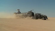 Initially the final stunt involving flipping and rolling The War Rig was going to be done with computer graphics. This idea was abandoned because according to Miller "You couldn't do a CG climax in a movie where everything else was real". Then the stunt was going to be performed with a model, but again "models don't work in day time, you can get away with them at night" according to George. A third option was a remote controlled vehicle but the stunt could not be performed precisely enough. Ultimately, the stunt was performed with a stunt driver (Lee Adamson[7]) behind the wheel of The War Rig, the difficulty being able to land the vehicle exactly between two big rocks and stop right in front of the camera. The stunt was filmed with 8 cameras simultaneously but Lee Adamson's amazing stunt driving skills allowed for the stunt to be performed perfectly on the first take.[8] Initially George Miller - who was watching the stunt on monitors from afar - was worried that Adamson landed on his head as the truck rolled over, thinking that the stunt driver shaved his head to look like Nux. It turned out, however that what Miller had seen on the screen was Nux's dummy visible through the sunroof of The War Rig and the stunt driver was steering the vehicle from the safety of a roll cage on the passenger side of the cabin.[9]