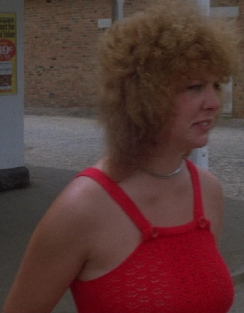 Woman in Red is standing outside next to Grinner when Toecutter and his gang drive into Wee Jerusalem. She eventually leaves with Starbuck in her truck and drives with Toecutter and the Nightrider's coffin in the bed of the truck.